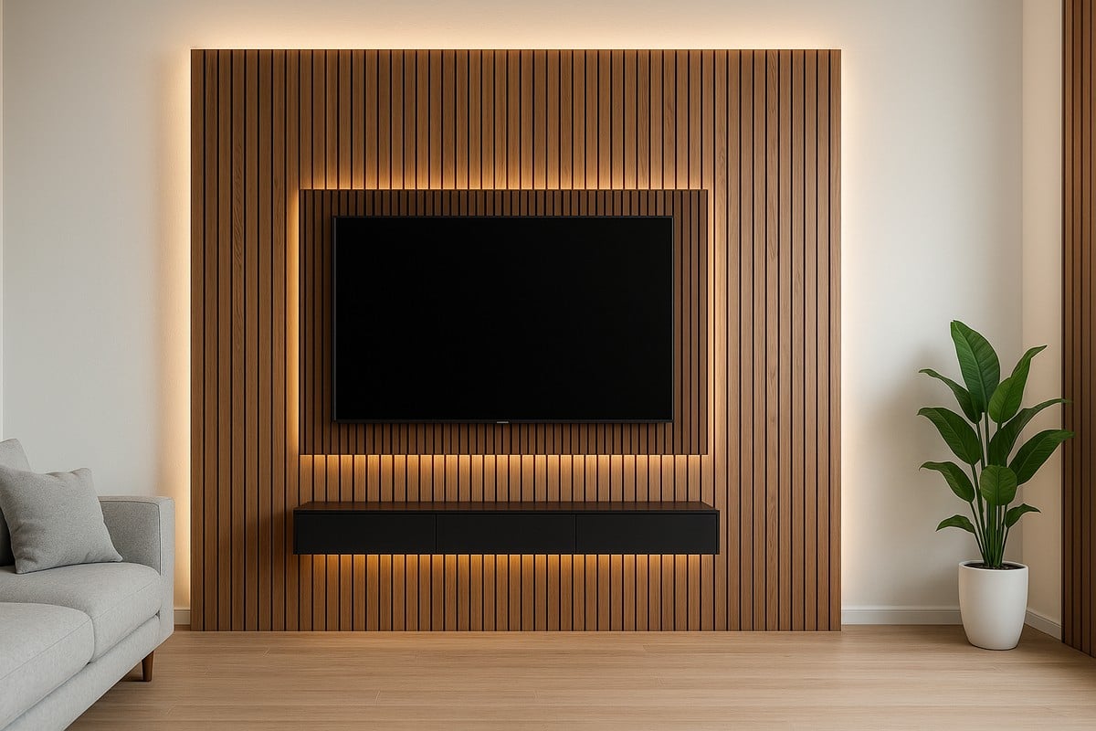 - Lamellás designpanel – keretként a TV köré, oldalfalra is; vagy borítsd vele kompletten a TV mögötti falat, és a panelre szereld a TV-konzolt.